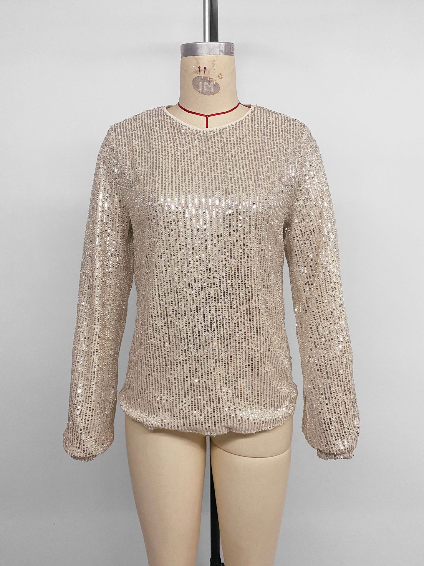 Elegant Party Round-neck Long-sleeve Sequin Hollow-out Backless Shirt
